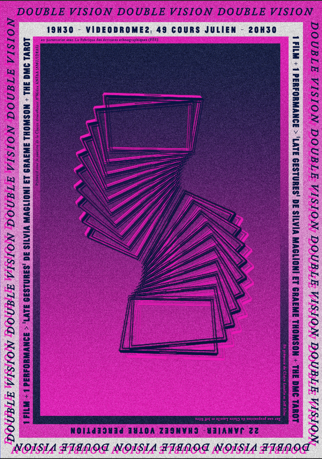 Pour cette première session de Double Vision, nous plongeons dans la matière noire du cinéma à partir de Late gestures  et du DMC Tarot  des artistes et cinéastes Silvia Maglioni et Graeme Thomson pour une session de tirage collectif comme occasion d'activer ensemble l'imaginaire contenu dans les plis de l'histoire du cinéma  et répondre autrement aux questions pressantes qui nous concernent.